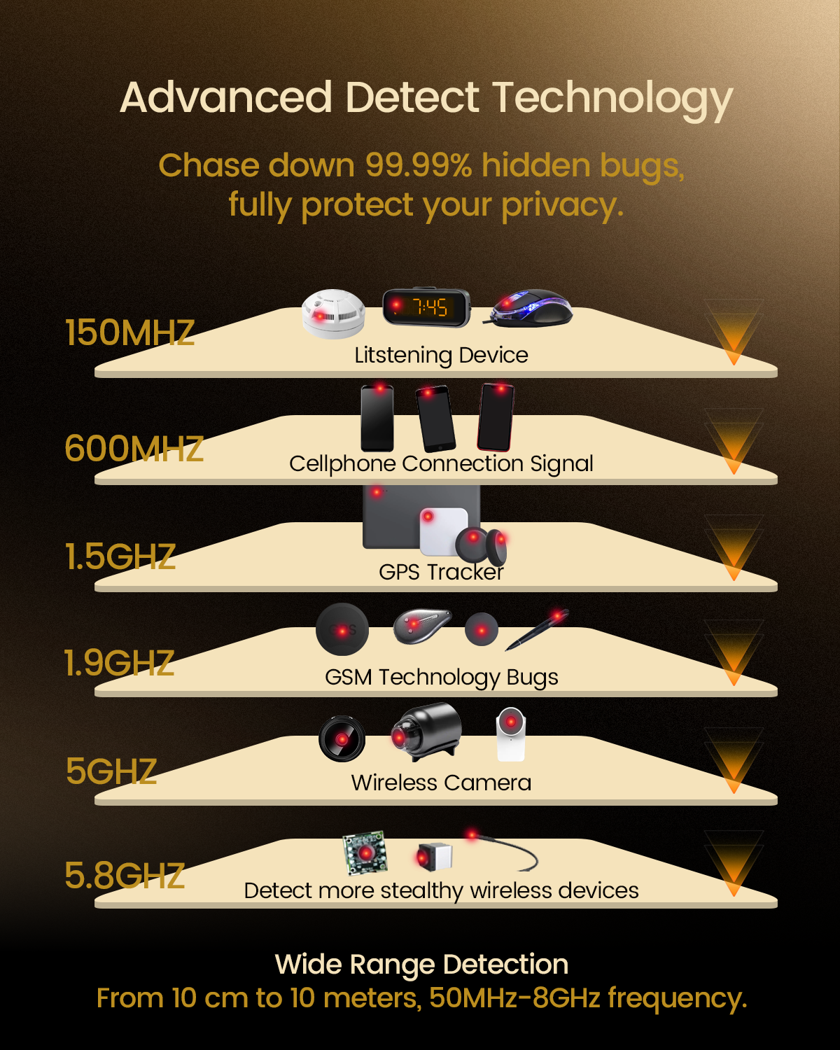 • Accurate Detection —- Adopts German advanced technology, which makes it much more accurate in detection, and able to detect more devices. This spy camera detector is a privacy protector you can trust